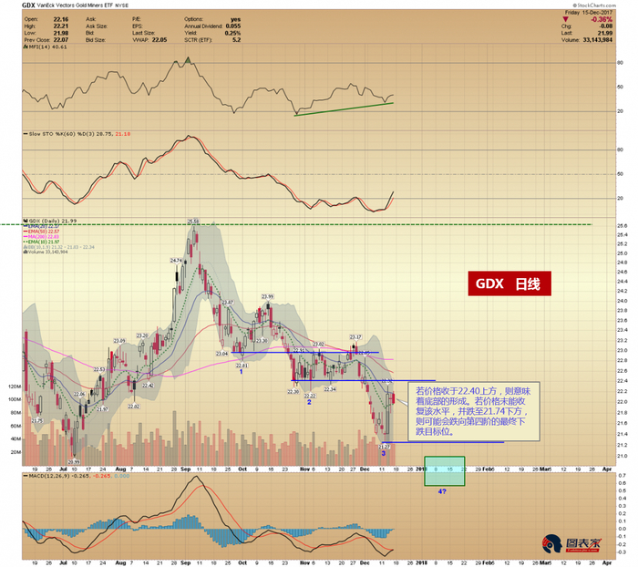 中小型黄金股ETF GDXJ的波动性比GDX更大。若价格在31.87(美联储决议日高点)上方收阳,则将意味着底部形成。但是,若价格跌破30.94,则可能会跌向第四阶的最终下跌目标位。
