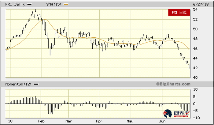 除了这两个关键因素,黄金近几个月表现不佳还和中国需求有关。具体来讲,投资者担心中美贸易战对中国的伤害要甚于对美国。此外,贸易战对中国股市的伤害也远远超过美股。下图显示的iShares China Large-Cap ETF (FXI)走势正好突出了这一点。