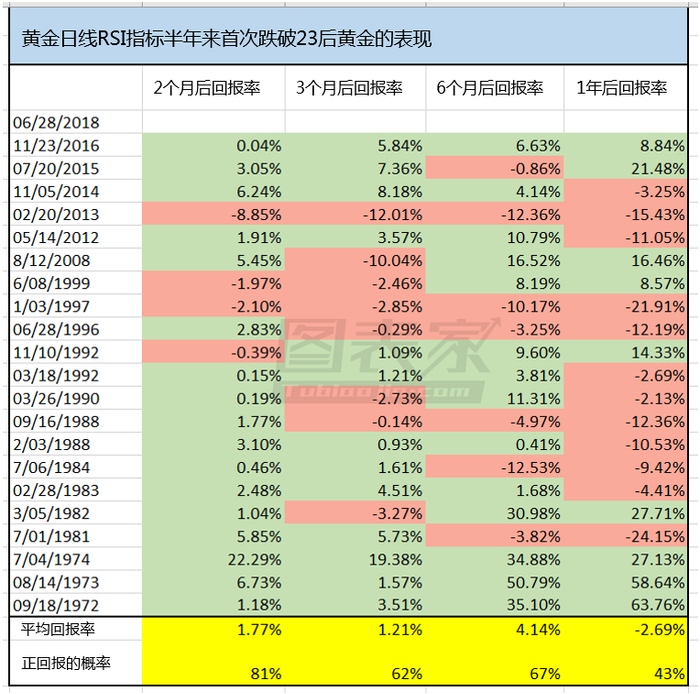 下表为日线RSI在半年来首次跌破23后黄金的表现。