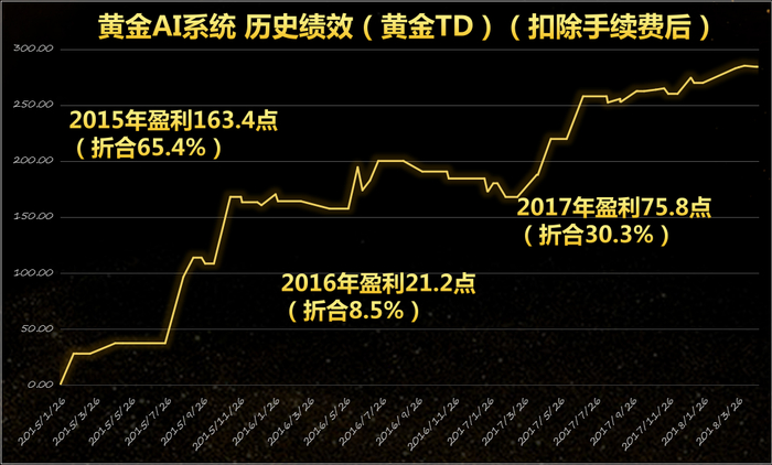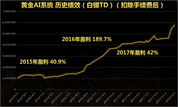 这两大优势我们正好都具备,我们也并没有辜负这个机遇,在2014年底便研发出第一套黄金AI决策系统,其中以进场、出场、趋势、震荡、仓位管理5类指标系统中各一个高胜算的组合指标(或创新型指标)为基础,灌注我们多年沉淀的经验,以绩效为导向,灵活协调组合指标之间的运用,并附带4条简单、有效的操盘规则。自黄金AI系统诞生至今,已连续超过3年(包括2018年上半年)录得稳健优异的绩效。