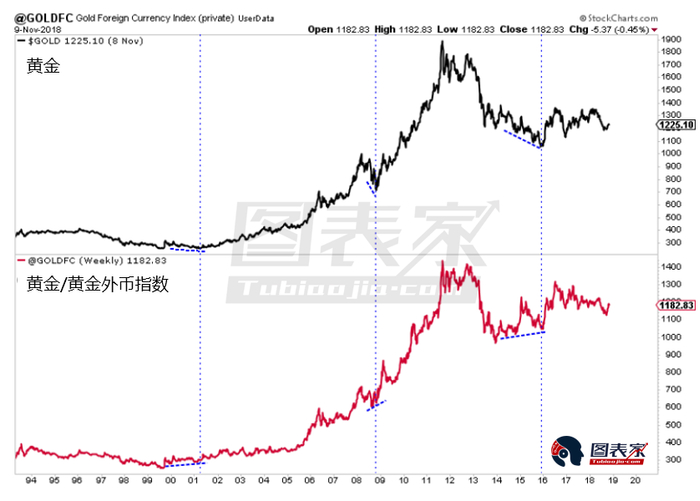 黄金跑赢美元以外的货币通常发生在美元维持在上升趋势的时候。这标志着黄金表现相对强势,显示出黄金并未被强势美元所挟持。这也可以预示美元将见顶。在2001年、2008年及2015年末金价触底之前,黄金跑赢外币。目前尚未出现有利的背离。