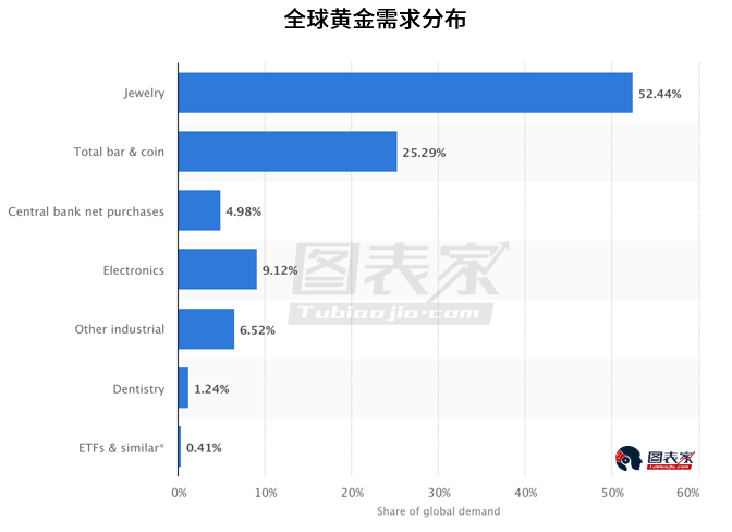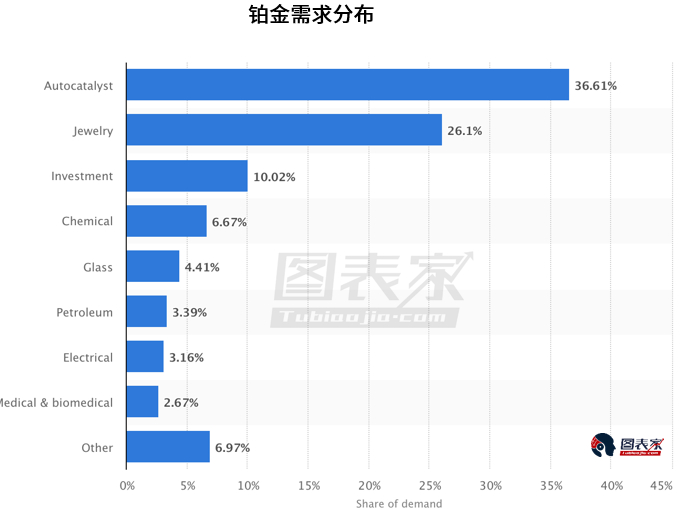铂金与两者不同。铂金具有极高的熔点,抗腐蚀能力强,导电性好。这意味着它有多种不同的用途。下图是2019年的情况。