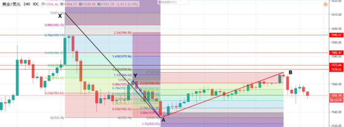 下方支撑关注1546~1548区域,该位置为0.382AB及此前的多个高低点水平,如回落企稳,则有望再次反弹测试1560甚至1570水平;如跌破1546~1548区域,则后市将进一步下探1536一线。