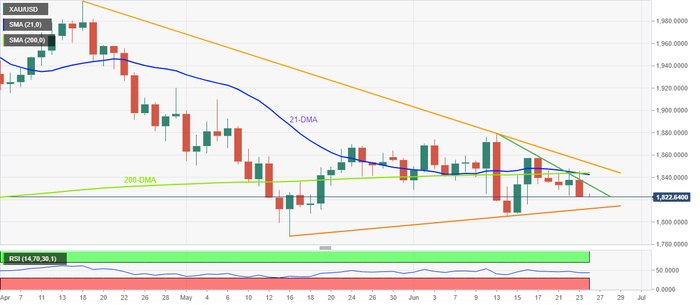 24K99讯 周五(6月24日)亚市盘中,现货黄金在昨日大跌之后小幅反弹,目前位于1824美元/盎司附近。知名财经网站FXStreet分析师Anil Panchal最新撰文,对金价技术前景进行分析。Panchal指出,金价周四创下一周来单日最大跌幅,眼下黄金空头目标瞄准1810美元/盎司。