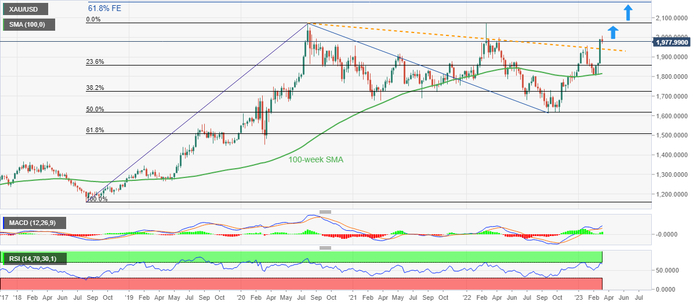 即使报价金价在1948美元上方仍然疲软,围绕1815美元的100周简单移动平均线(SMA)水平似乎是黄金买家的最后一道防线。