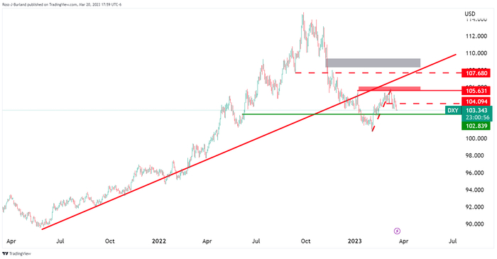 “102.80水平上,正守卫继续下行至2月低点101.00的前景。”