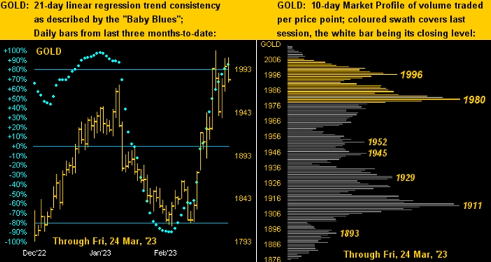 “这反过来又将我们引向我们的黄金双面板图形,左侧是三个月前至今的日线图,以及趋势一致性的淡蓝色圆点:再次注意黄金上升快于下跌的现象。右边是黄金的10天市场概况,表明1980美元的高点是近期保持的关键水平,以免价格回调至1911美元。”