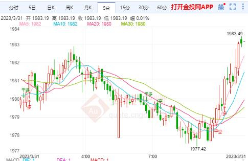 周五(3月31日)本交易日,现货黄金开于1978.08美元/盎司,最高上探至1983.49美元/盎司,最低触及1977.42美元/盎司,截至发稿金价暂报1982.03美元/盎司,涨幅0.09%。