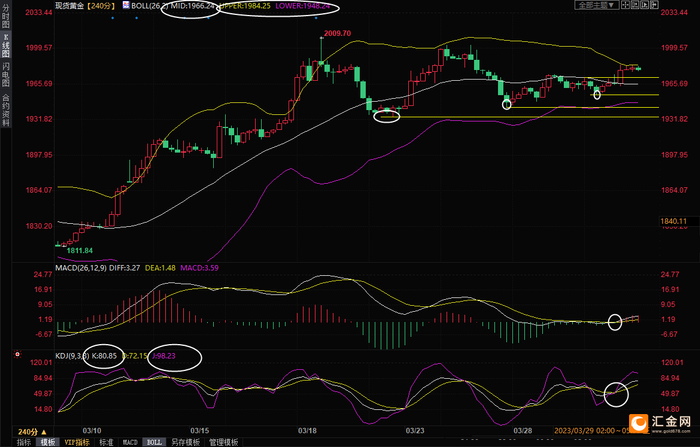 4小时级别:震荡;继续留意布林线轨道1948.25-1984.24区域突破情况;目前KDJ金叉,MACD金叉,若能顶破布林线上轨1984.24附近阻力,则有望启动新一轮涨势,进一步阻力参考2000整数关口,近期高点阻力在2009.70附近,该位置上方短线无明显阻力,建议分别参考2020、2030和2040等整数关口位置。