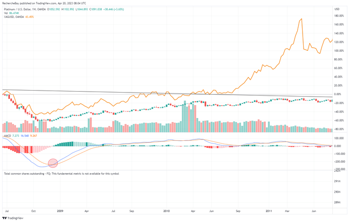 铂金价格飙升至其阻力线上方对白银来说是个好消息。2008年12月,铂金为白银发出了随后几年大牛市的信号: