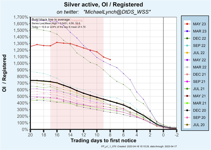 每个月的未平仓合约,大于可供交割的实物白银数量。在下图中可以看到,近几个月合约量高达可交割白银量的15倍。而且这些合约的展期越来越大,当月仍有相当于12倍的白银可供交割。