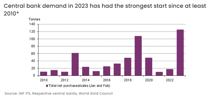 去年,央行对黄金的需求创历史新高。这些购买在1月和2月继续进行,标志着自2010年以来最强劲的开端。