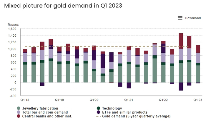 金条和金币投资同比增长5%至302吨,掩盖了一些较大的区域差异。 相比之下,ETF的净负需求虽然为-29公吨,但与2022年第一季的大量流入相比产生大幅的同比下降。