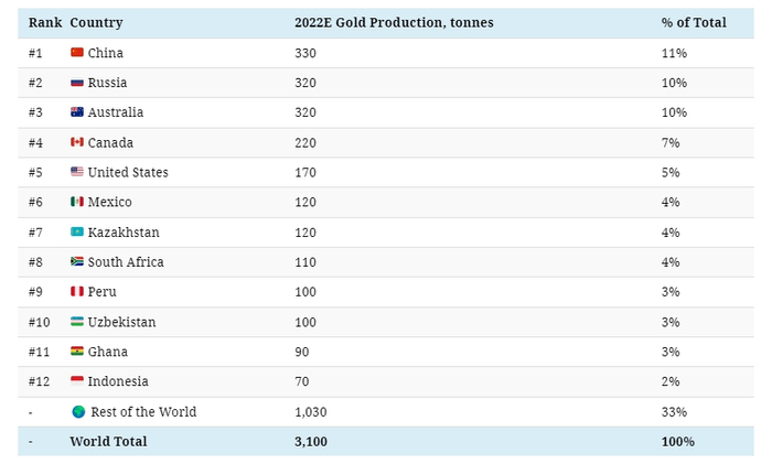 到2022年,全球约31%的黄金产量来自中国、俄罗斯和澳大利亚这三个国家,它们的黄金产量均超过300吨。