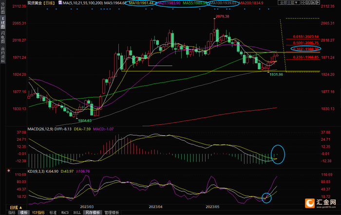 日线级别:震荡下跌后反弹;金价在100日均线的多重支撑位附近获得支撑后持续反弹,KDJ金叉良好运行,MACD绿色柱萎缩且有金叉趋势,5日均线初步上穿10日均线,在失守10日均线1961.52前,金价存在进一步反弹机会,初步阻力在21日均线1983.97附近,进一步阻力在2079-1932跌势的38.2%回撤位1988.36附近,55日均线阻力也在该位置附近,若能顶破该阻力,则有望进一步试探2000整数关口阻力,并增加看涨信号。