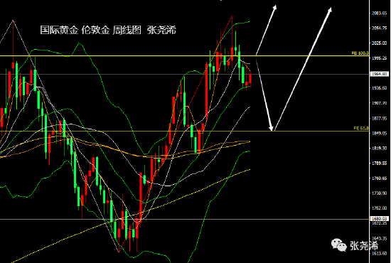 那么,上方则重点关注斐波拉契扩展线100数值2000美元关口的位置,持稳在此之上则看好持续走强刷新高点,下方则重点关注中轨线支撑,跌破将有再度走低的风险,并有望跌至扩展线FE61.8的1852美元附近支撑位置后,看回落修正完毕,并再度开启新的牛市走强行情。