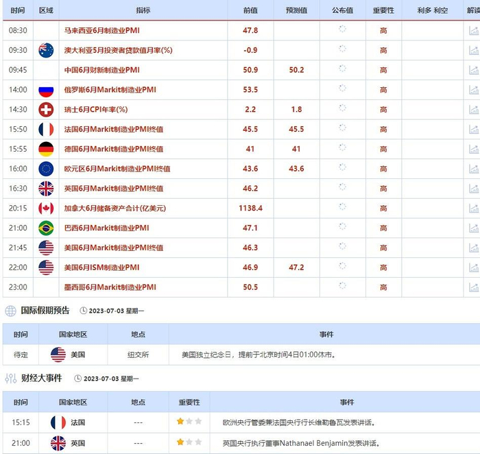 ①7月3日(周一)关键字:欧元区6月Markit制造业PMI终值,美国6月Markit制造业PMI终值