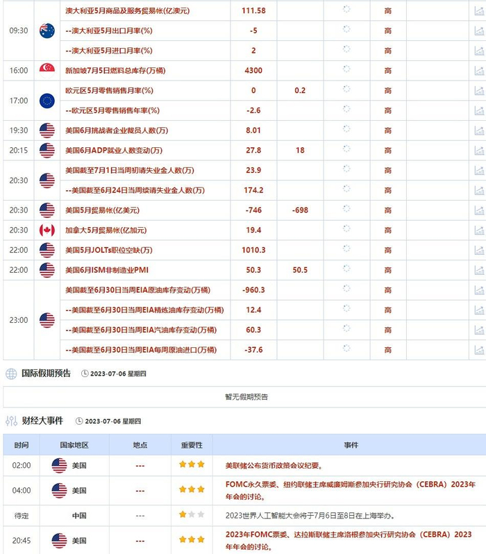 7月6日当天,纽约联储主席威廉姆斯参加央行研究协会(CEBRA)2023年年会的讨论,达拉斯联储主席洛根参加央行研究协会(CEBRA)2023年年会的讨论,投资者需关注他们对于经济和货币政策前景的最新看法。