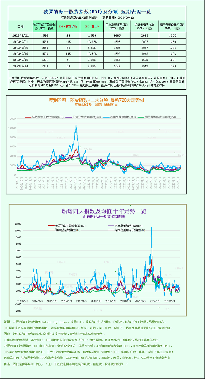 最新数据显示,2023年09月22日 波罗的海干散货指数(BDI)报 1593 点,创2023年05月11日以来新高水平,较前值涨1.53%。