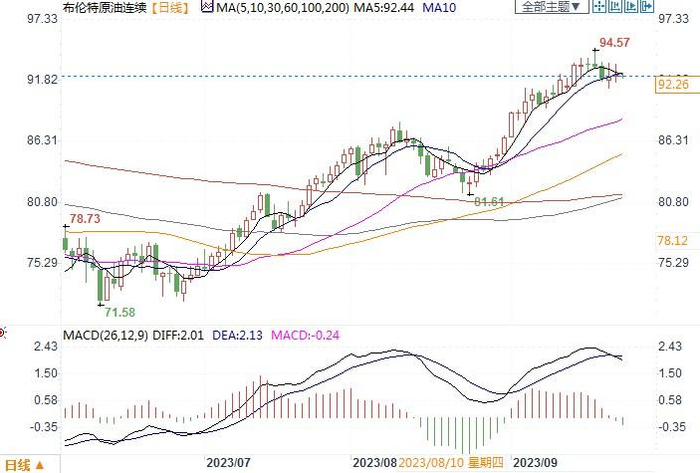 北京时间9月25日14:00 布伦特原油连续 报 92.26 美元/桶