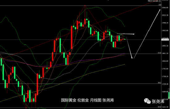 技术上:月图级别,金价近几月走势继续维持在1990-1890美元的区间之内未破,目前走势偏弱震荡,承压于5月均线下方,附图指标信号有转空看跌的倾向,暗示后市回落跌破区间支撑,并触及30月均线支撑的概率依然很大。