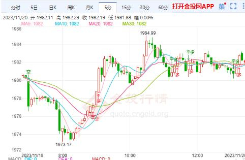 周一(11月20日)本交易日现货黄金日内维持震荡走势,今日开盘报1979.89美元/盎司,最高触及1984.99美元/盎司,最低触及1973.17美元/盎司,截止发稿金价报1982.09美元/盎司,涨幅0.11%。