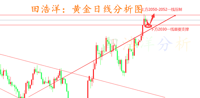 从日线分析来看,昨日虽然价格向下击穿近期多头颈线位2035一线,但技术指标却出现强势修正,整体技术形态依旧保持多头强势区间内运行,下方守住2030关口有望延续多头强势上涨,短线压力关注2050-2055一线,晚间回踩不破2030一线可先多一次看反弹回升,具体操作策略我会在盘中提示,及时关注。