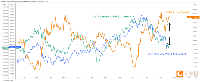 黄金价格走势本质上与美国国债收益率以及美元指数呈反向关系。当美元走弱,这会刺激买家购买黄金。由于黄金没有收益率,当收益率下降、持有黄金机会成本下降时,黄金的吸引力就会增加。