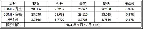 第一黄金网讯 北京时间1月17日,COMEX黄金今日开盘2031.7美元/盎司,最高上探至2036.1美元/盎司,最低触及2029.0美元/盎司,截至发稿报2031.6美元/盎司。