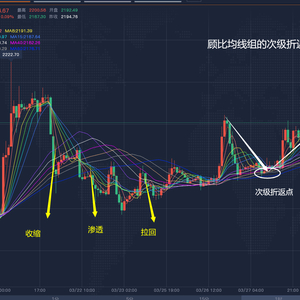 1、顾比均线组:目前1小时周期的短期均线组和长期均线组经历收缩-渗透-拉回的粘合行情后,现皆呈向上发散状态,即说明行情处于稳定向上阶段,次级折返完成,后市整体可看上行。后市若行情再次收缩渗透至长期均线组,可根据盘面综合判定行情是否再次进入次级折返或者反转形态!