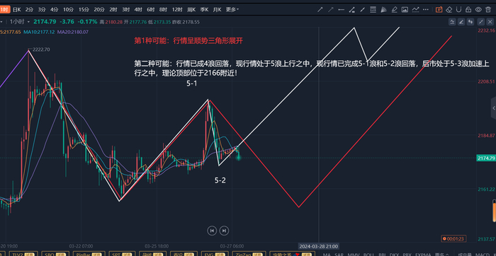 (1)、将4浪细分成顺势三角形结构,如图所示,即4-a浪于2157提前结束,现行情处于4-b浪反弹之中!根据波浪理论可知,4-b浪将于a浪起点附近结束,即后市处于短线上行之中,行情于2200上方录得反转形态后再下行至2150附近完成4浪调整!如图中红色线所示