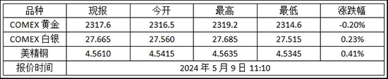 第一黄金网讯 北京时间5月9日,COMEX黄金今日开盘2316.5美元/盎司,最高上探至2319.2美元/盎司,最低触及2314.6美元/盎司,截至发稿报2317.6美元/盎司。