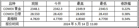第一黄金网讯 北京时间5月14日,COMEX黄金今日开盘2342.3美元/盎司,最高上探至2349.9美元/盎司,最低触及2340.5美元/盎司,截至发稿报2348.1美元/盎司。