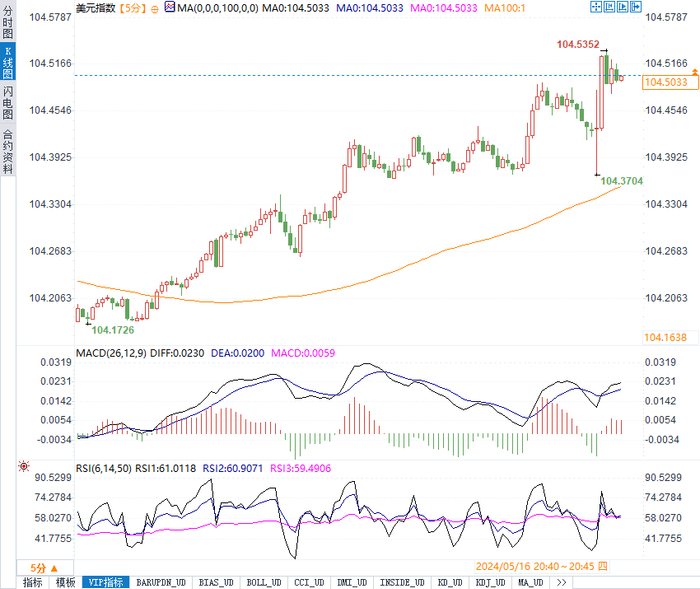 在金融市场方面,现货黄金在数据公布后短线跳涨5美元最后迅速回落6美元,日内转跌,跌幅0.12%,失守2380美元关口。美元指数短线拉升16点,现报104.5190点。