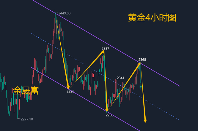 周五黄金冲高2368展开暴跌,我们实盘2365-67空单从头吃到尾,行情走势完全符合我们上周的预期。黄金4小时连阴下跌,昨晚美盘数据利空之后直接大跌破位,黄金2340短线已经形成多空分水岭,黄金下周2340下继续逢高干空。黄金周线收冲高回落的阴线,利于空头,日线更是大阴线杀跌,没有大利多消息,根本没有机会反转。那么黄金就还是继续弱势,黄金反弹2340下都是给逢高干空的机会,若行情没有这么强势,那再触及2332-35也是机会,下方目标位就是2280一线,甚至直接到2170附近,也就是说整体下周看下跌,日线级别出现泰山压顶了,k线直接被打弯了,一个大阴线击穿一周的反弹幅度,空,继续看2280下方;综合来看,下周一黄金短线操作思路上金晟富建议反弹做空为主,回调做多为辅,上方短期重点关注2333-2335一线阻力,下方短期重点关注2295-2290一线支撑,各位朋友一定要跟上节奏。要控制好仓位及止损问题、严格设止损,切勿抗单操作。具体点位以盘中实时为主,欢迎前来体验,交流实时行情,进群关注实时单。
