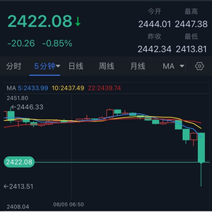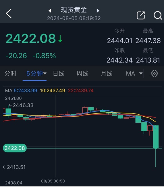 近期与股市走势一致的黄金也出现重挫。现货黄金周一亚市早盘短线大幅下挫,目前位于2422美元/盎司附近,日内大跌逾20美元。