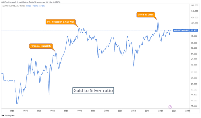 在经济困难或通货紧缩时期,该比率会上升,因为黄金被视为更稳定的价值储存手段,因此更受欢迎。相反,在经济扩张时期,当工业对白银的需求增加时,该比率通常会下降。投资者、交易员和经济学家密切关注这一比率,以判断市场情绪并发现潜在的投资机会。