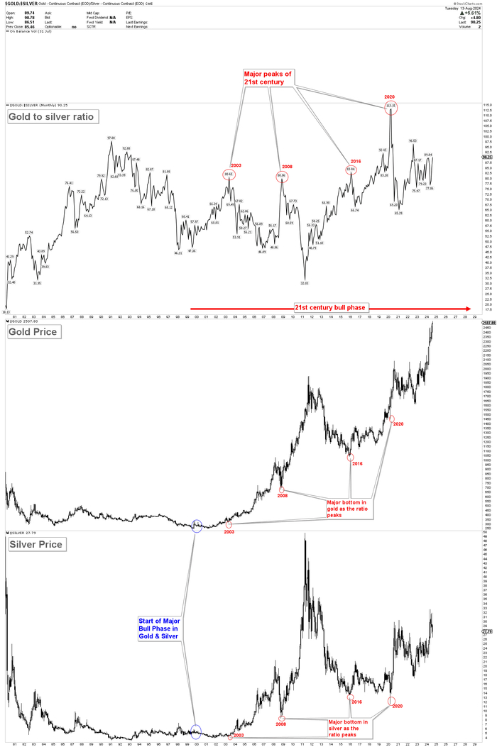 为了更好地了解金银比的动态及其对黄金和白银市场的影响,下面的月度图表展示了金银比与这些市场之间的相关性。据观察,21世纪黄金和白银的牛市与该比率直接相关。该比率的主要峰值与黄金和白银市场的主要底部相对应。