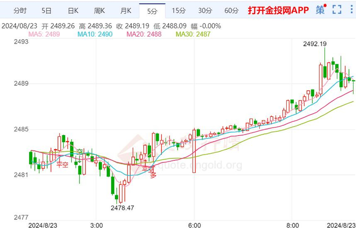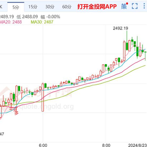 周五(8月23日)本交易日现货黄金日内维持震荡走势,今日开盘报2481.90美元/盎司,最高触及2492.19美元/盎司,最低触及2481.20美元/盎司,截止发稿金价报2488.57美元/盎司,涨幅0.17%。美联储7月货币政策会议纪要透露出9月可能降息的信号,推动金价小幅上涨。GTC泽汇资本表示尽管黄金市场目前徘徊在盘中高点附近,但看涨势头依然有限。
