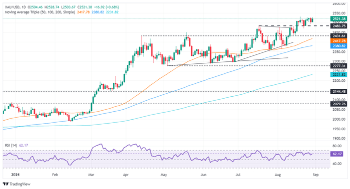 FXStreet分析师Christian Borjon Valencia指出,周四金价仍保持上涨趋势。随着金价突破2520美元/盎司,买家仍然希望金价能够突破历史高点2531美元/盎司。正如相对强弱指数(RSI)所描绘的那样,势头表明买家正在掌控局面。在这种背景下,金价阻力最小的路径是上行。