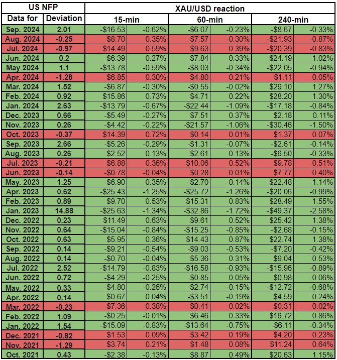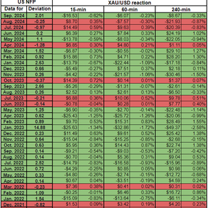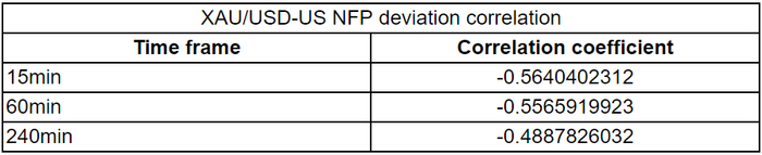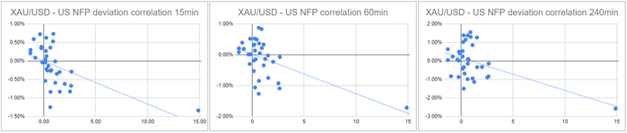 我们绘制了非农数据发布后的15分钟、1小时和4小时内的黄金价格反应。然后,我们将黄金价格的反应与实际非农结果与预期结果之间的偏差进行比较。