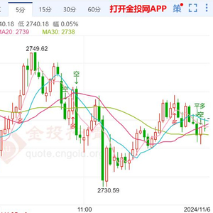 周三(11月6日)本交易日现货黄金日内维持震荡走势,今日开盘报2743.32美元/盎司,最高触及2749.62美元/盎司,最低触及2730.59美元/盎司,截止发稿金价报2740.42美元/盎司,跌幅0.13%。