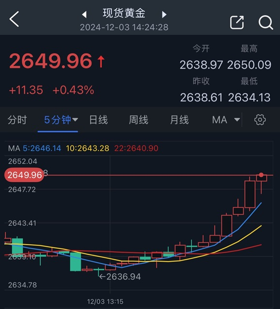 北京时间14:24,现货黄金报2649.96美元/盎司。