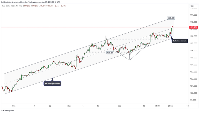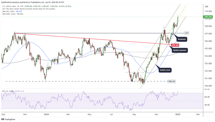 美元指数日线图显示,美元指数突破关键水平107,并保持强劲。新年假期后,该指数继续上涨,保持看涨势头。在105.60支撑位形成看涨锤头,表明该指数可能继续走高。虽然RSI接近超买水平,但上涨势头依然强劲,表明短期内还有进一步上涨的潜力。