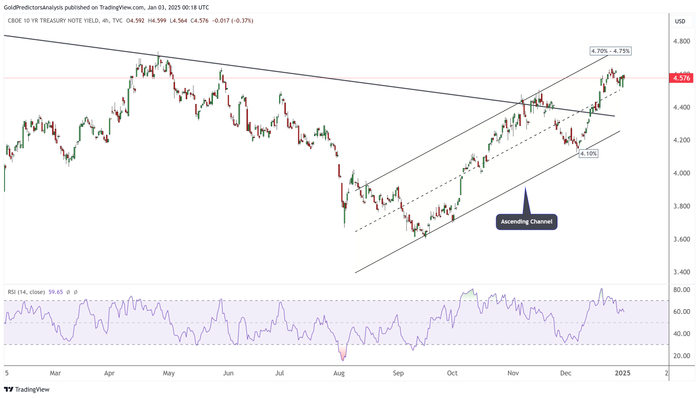 市场正在等待下周的非农就业数据,这将为2025年的政策决定提供进一步的线索。与此同时,美国国债收益率保持强势,接近4.64%-4.75%的关键阻力区,市场正在等待下一步行动。