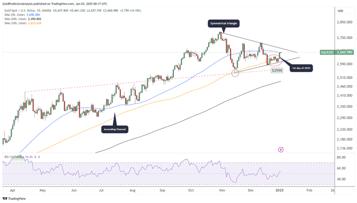 黄金日线图显示,价格在对称三角形内交易,等待下一个方向。2025年的第一天表现强劲,价格从三角形支撑位反弹。价格正在挑战50日均线,看起来很强劲。然而,需要突破对称三角形才能进一步上涨。RSI突破中线,价格接近50日均线,表明看涨势头。突破2720美元对于维持黄金市场的上涨趋势至关重要。