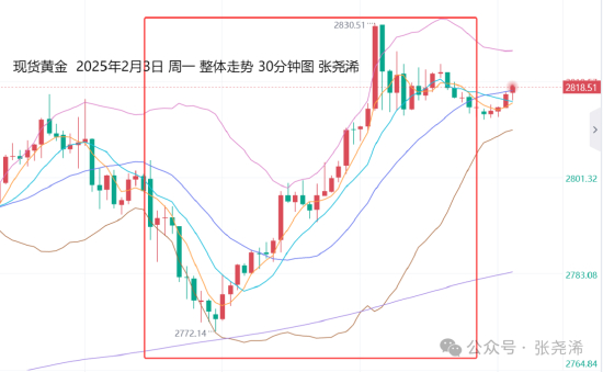 具体走势上,金价自亚市高开于2803.50美元/盎司,则先行走弱,延续上周五的回撤压力,于午间11点半录得日内低点2772.01美元,之后则触底回升,持续反弹,延续到美盘22点半多头爆发,进一步强势拉升刷新历史高点至2830.54美元,之后迅速遇阻回撤收复拉升的涨幅,但空头也未持续,最终维持在2813美元一线上方震荡盘整,最终收于2814.50美元,日振幅58.53美元,相对于开盘价收涨11美元,涨幅0.39%。相对于上周五收盘价2799.51美元收涨14.99美元,涨幅0.54%。