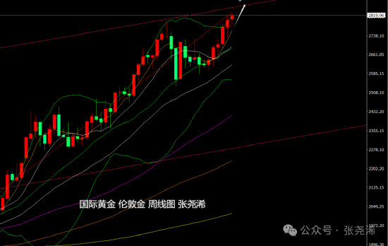 周线级别:金价上周连续第五周反弹走强收阳,本周在短暂回落调整后,临近5周均线支撑位置再度走强,同时也暗示本周回调结束,多头将占据主导,再加上布林带开口向上,暗示仍有上行空间,故此,短期将继续看涨为主,等待进一步冲击2850美元附近。