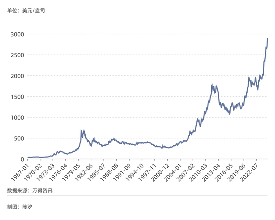伦敦黄金现货市场是世界最主要的黄金交易市场之一,到了1968年底,黄金价格来到了41美元/盎司。1971年,尼克松宣布美国不再承担美元的黄金兑换义务,布雷顿解体。黄金价格开始暴涨,到1980年价格突破600美元/盎司。短短十年,黄金涨了17倍。