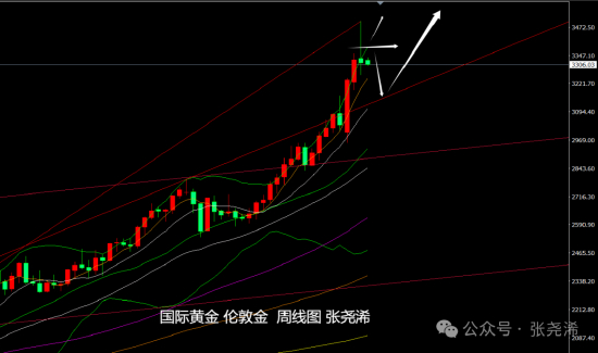 技术上:月图;金价本月剧烈震荡走盘,振幅达540多美元,最低触及2956.55美元,最高触及3500美元;目前仍持有200美元左右的涨幅,多头仍显强势,并且走势也持稳在上升趋势线(2016年高点1375美元到2020年高点2075美元向上链接的趋势线)上方,只要维持在此趋势线上方,则暗示后市仍有继续走强上攻新高的潜力和空间。